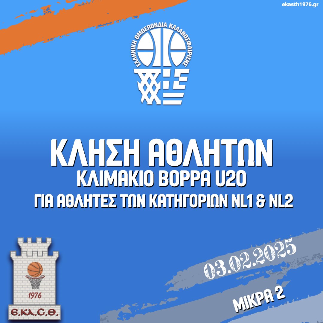 Κλήση αθλητών κλιμακίου ΒΟΡΡΑ U20 ΓΙΑ ΑΘΛΗΤΕΣ ΤΩΝ ΚΑΤΗΓΟΡΙΩΝ NL1 & NL (2 3/2/2025 | ΜΙΚΡΑ Β' )